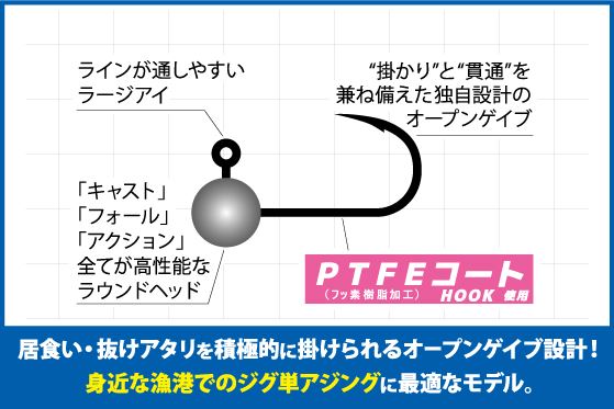 ■商品説明 掛かりと貫通を兼ね備えた独自設計のオープンゲイブ。 国産・PTFEコートフックを使用。 ラインが通しやすいラージアイ。 キャスト、フォール、アクション全てが高性能なラウンドヘッド。 ■仕様 規格:0.4g-#6 PTFE(フッ素)コート採用 ラージアイ 入数:4個入 ■注意事項 ※画像はイメージです。サイズ、カラー違いの商品を含みます。実際の商品とは異なる場合があります。 ※表示している一個あたりの重量は平均値です。多少のバラツキはご了承ください。