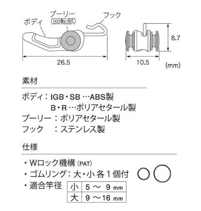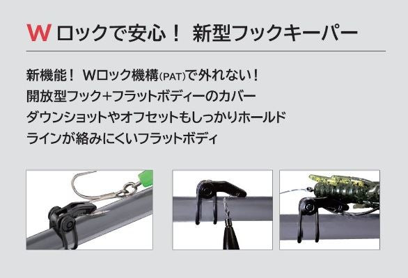■商品説明 Wロックで安心!新型フックキーパー 新機能!Wロック機構(PAT.P)で外れない! 開放型フック+フラットボディーのカバー ダウンショットやオフセットもしっかりホールド ラインが絡みにくいフラットボディ ■仕様 カラー:ブラック ボディ:ポリアセタール製 プーリー:ポリアセタール製 フック:ステンレス製 Wロック機構(PAT) 入数:1個 付属品:ゴムリング大・小 各1個付 ■注意事項 ※画像はイメージです。サイズ、カラー違いの商品を含みます。実際の商品とは異なる場合があります。