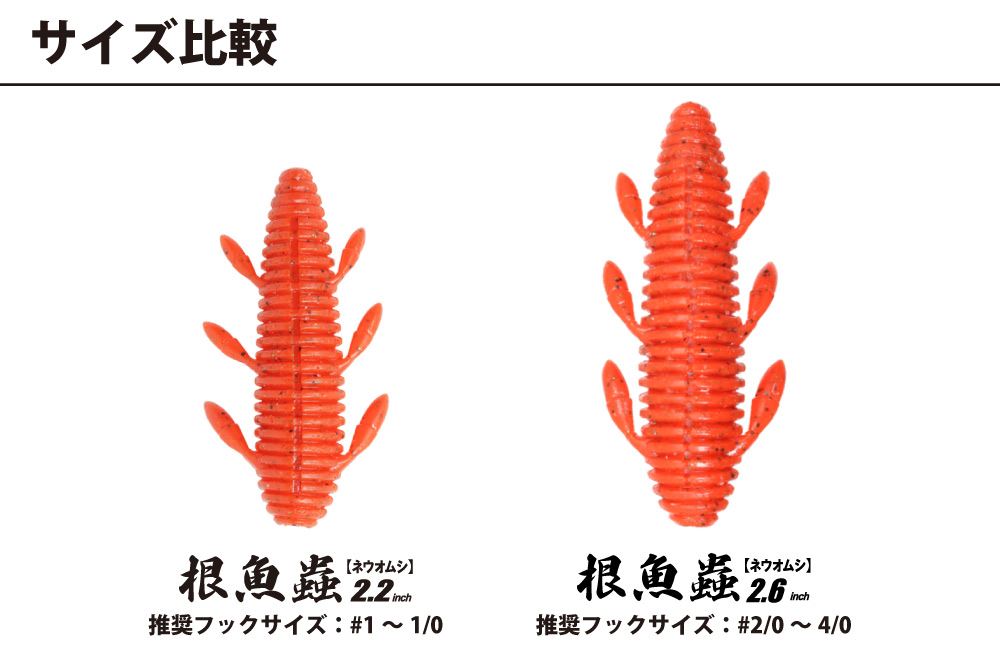 万能ロックフィッシュワーム『根魚蟲』がヘビーソルトモデルとして登場! 『根魚玉』とのセット、テキサスリグなどに用いてリフト&フォールさせればまるで太い尾を持つ生物が尾を振り回すような動きで波動を生み、タダ巻きすれば太いボディがふわふわと水を押し、3対の脚がピリピリと動いて微波動を生み出します。クイックなアクションでもスローなアクションでも、タダ巻きでも根魚を魅了します。比重を高めたことにより海水への親和性が高まりこれまで以上のナチュラルなアクションを実現。高い食わせ力を誇ります。