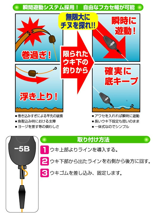 ・最初にウキゴムをラインに通しておくことで、自由に且つすばやくウキを交換できます。