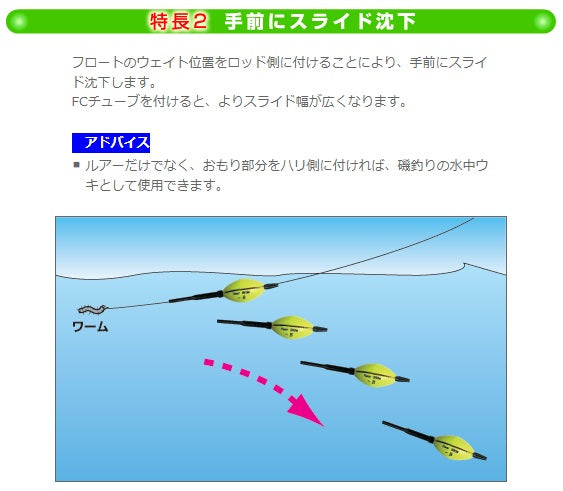 ・フロートのウェイト位置をロッド側に付けることにより、手前にスライド沈下します。