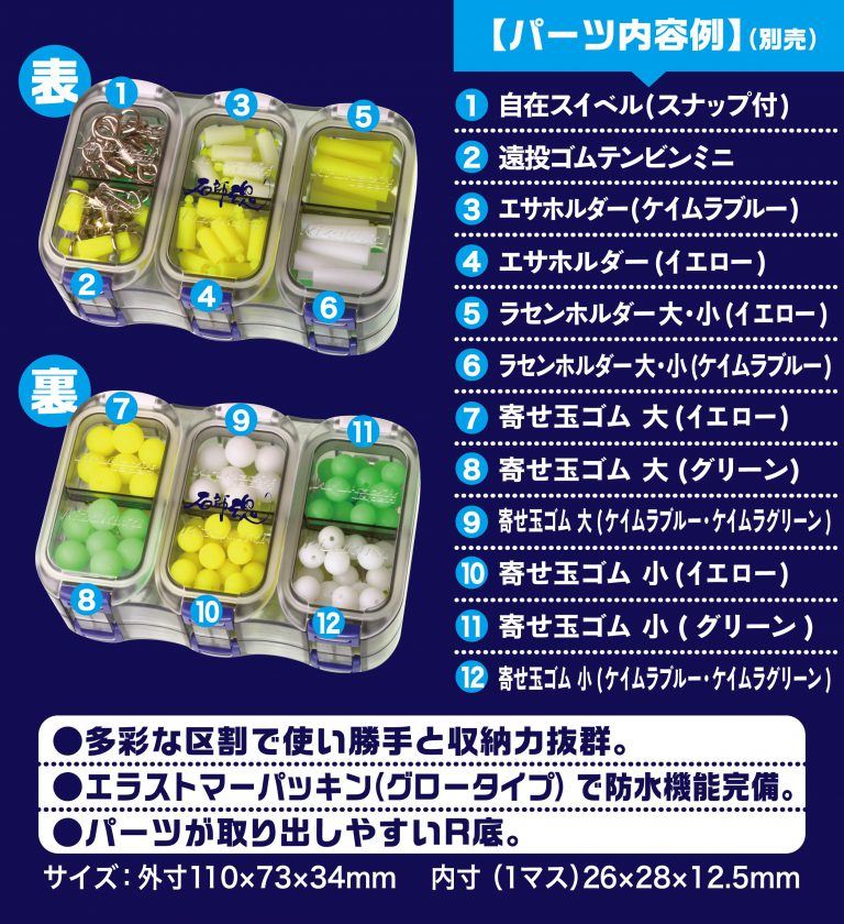 ■商品説明 石師魂パーツをほぼ収納できるパーツケースです。 ライフジャケットのポケットに入るサイズのため、仕掛け交換がスムーズでチャンスを逃しません。 多彩な区割で使い勝手と収納力抜群。 エラストマーパッキン(グロータイプ)で防水機能完備。 パーツが取り出しやすいR底。 ■仕様 本体外寸:110×73×34mm 内寸(1マス):26×28×12.5mm ■注意事項 ※画像はイメージです。サイズ、カラー違いの商品を含みます。実際の商品とは異なる場合があります。 ※お届けする商品はケースのみです。画像の中身は付属しません。