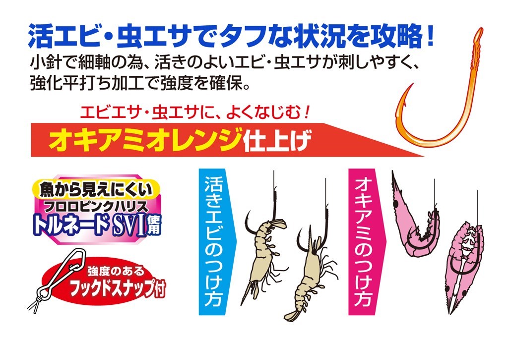 ネリエなどにスレた真鯛やシマアジなどの目先を変えて喰わせる、活きエビ、虫エサ対応仕掛。魚に見切られにくいピンクハリスと小さめのハリで小さなネリエやオキアミなどにも対応します。