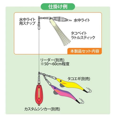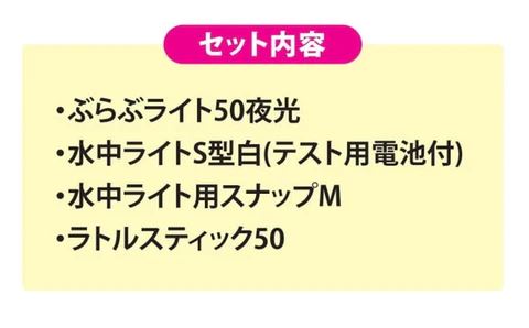 ■商品説明 音、光、動きの3冠王! タコ用集魚グッズの決定版! 音(ラトルスティック)、光(LED集魚ライト)、動き(夜光タコベイト)、タコに効く3つの要素がセットになった集魚グッズ! また、付属のタコベイトとLED集魚ライトを仕掛けにセットする為のスナップも標準装備。 いつもの仕掛けにそのままプラスで取り付けるだけで直ぐに使用出来ます。 ■仕様 耐水圧(水中ライト):耐水圧800m 連続発光時間(水中ライト):約30時間 ケミホタル対応サイズ(タコベイト):ケミホタル50(別売)、寄ってこい ラトルスティック50 ■セット内容 ぶらぶライト50夜光(タコベイト)×1個 水中集魚ライトS型(白)×1個 水中ライト用スナップM×1個 ラトルスティック50×1個 ■注意事項 ※画像はイメージです。サイズ、カラー違いの商品を含みます。実際の商品とは異なる場合があります。 ※点灯パターンによって発光時間は異なります。 ※新品電池を使用した場合の目安となります。 ※付属のテスト用電池は動作確認用です。電池残量が少なくなっておりますので、ご使用の際は新しい電池に交換して下さい。 ※タコベイト内にセットして下さい。 ※ケミホタルは別売となります。