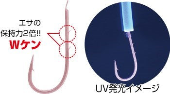 (3)カモフラージュ効果&Wケン:鈎はカモフラ効果の高い甘エビケイムラ。エサ盗りに強いWケン採用。