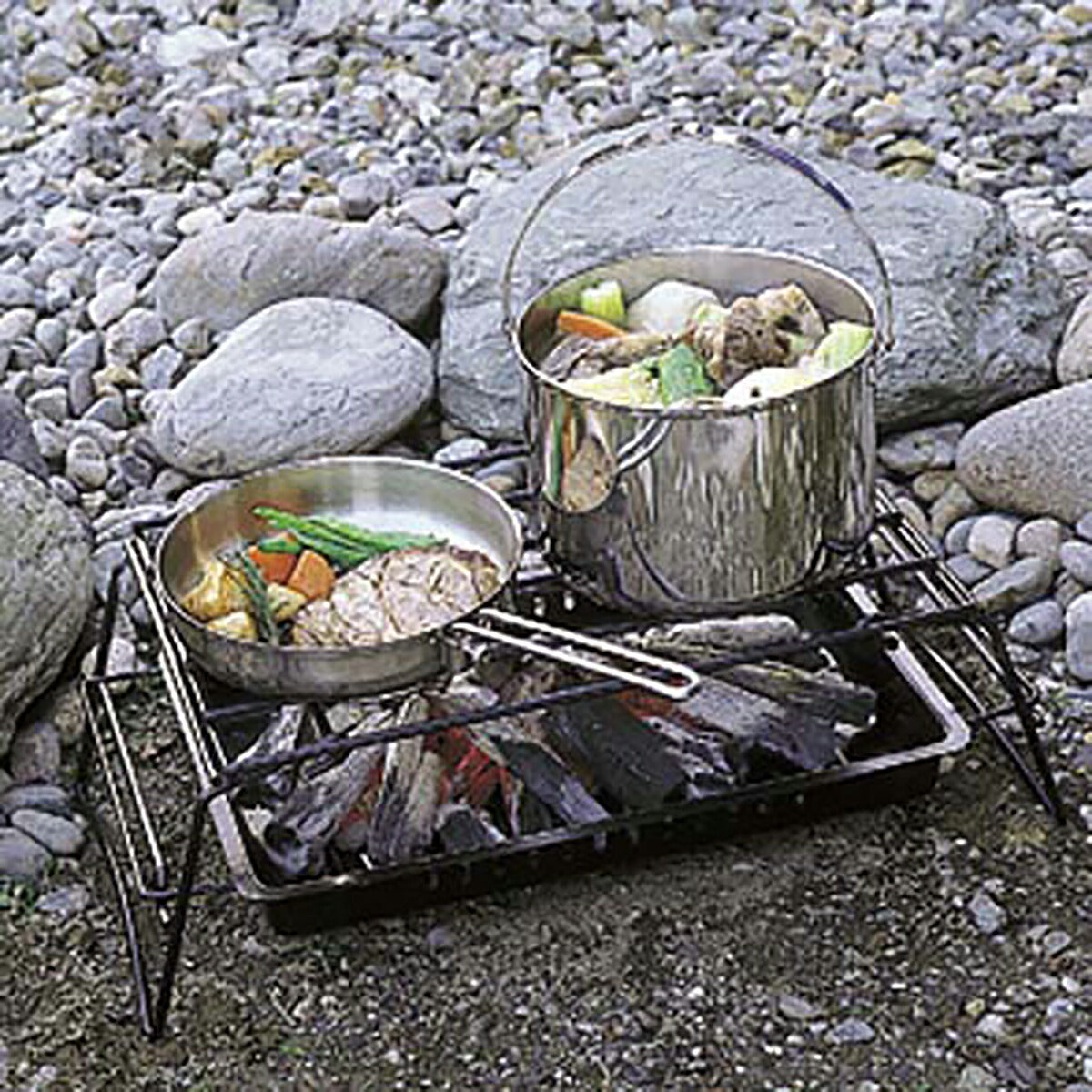 ・クッカーやフライパン料理に最適で、バーベキューコンロの上ではスタンドをのせるとダッチオーブン等が使用できます。