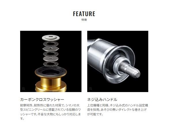 またハンドルにはガタの少ないねじ込み式、ドラグワッシャーには耐久性の高いカーボン素材を採用するなど、コンパクトながら、大物とも安心してやりとりできる頼れるリールです。