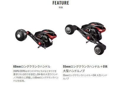 200PG/201PGはエギタコやヒラメなどタフさを要求される釣りを想定しCI4+の特大ハンドルノブを新たに搭載した60mmロングクランクハンドルを採用。