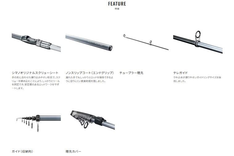 キャスト・ファイト時などの高負荷を頼もしくアシストする基本構造スパイラルX、リールのガタつきを防止するスクリューシート、脇挟みでの保持が可能なリールシート長など、細部の性能まで、アングラーにストレスフリーで軽快な実釣性能の提供を追求しました。