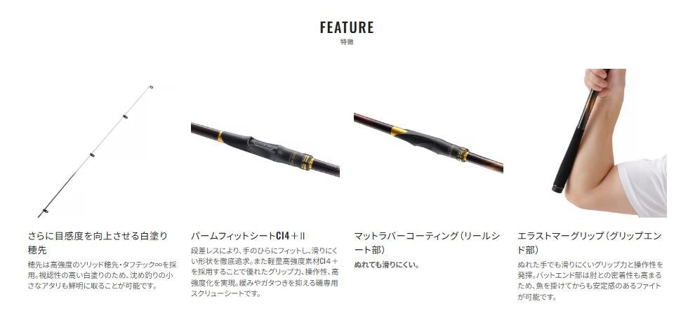 穂先には、目感度に優れた白塗りのタフテック、ファイトの際にはグリップエンドのスリップを軽減し、安定感を付与するエラストマーグリップなど、細部の性能までも徹底追求。