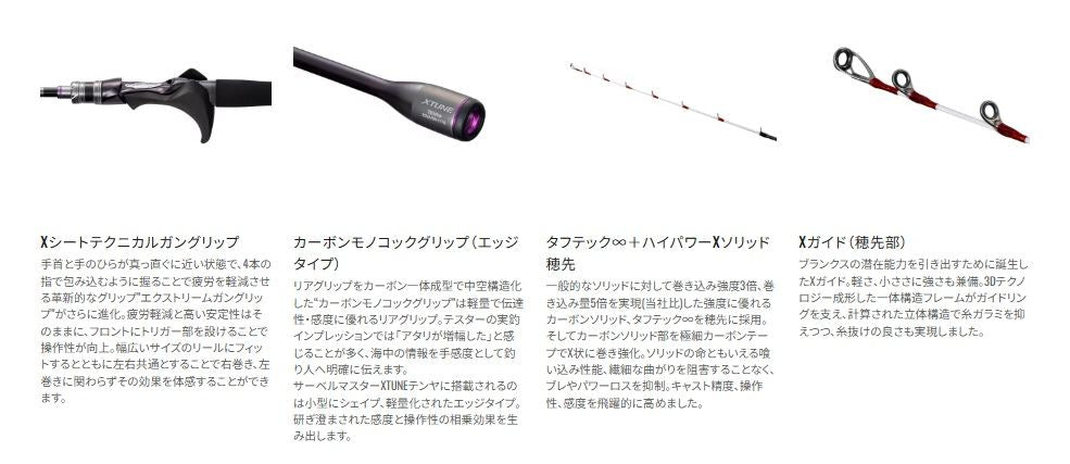 また、糸ガラミの発生しやすい穂先部には軽量でトラブルレスなXガイドを搭載し、タチウオとの真っ向勝負をサポート。