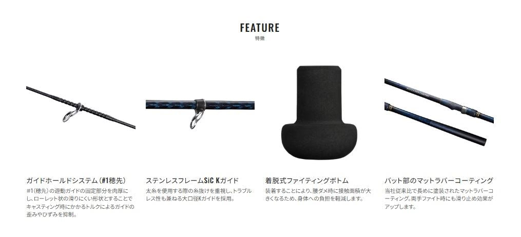 ファイト時にはアングラーの負担を軽減するために、フロントグリップは両手で保持しても滑りにくいマットラバーコーティング、腹当てファイトの負荷を分散する着脱式ファイティングボトムを採用することで大型魚との格闘を頼もしくサポート。