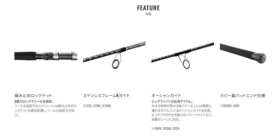 ラインナップはすべてスピニングタイプで、近海テクニカルモデルのS70L、S73ML、S710ML、S80Mや、大型青物&マグロ類対応のパワーモデルであるS82MH、S82Hを揃えた全6アイテム。