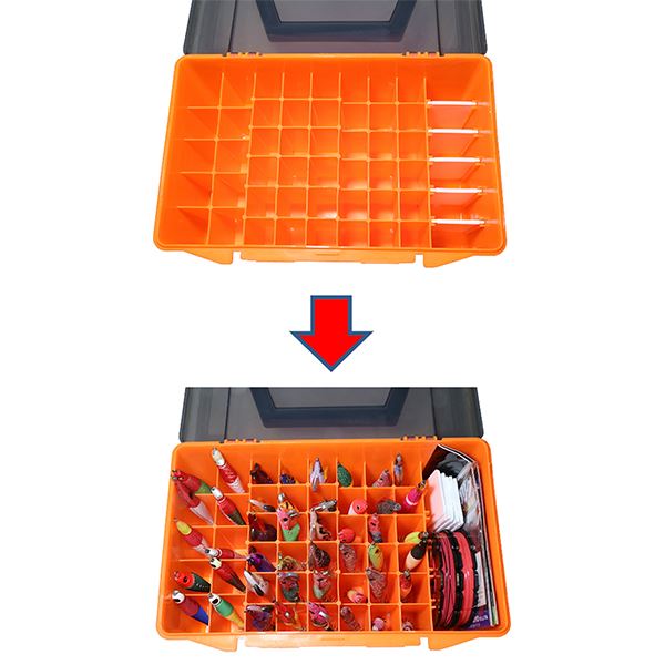 ■商品説明 鉛スッテ、エギ、スッテ等が大容量収納出来るケース。 仕切り付で針も引っかからず出し入れ簡単。 仕切りは、大・小~高・低となっており号数、長さに応じて収納可能。 右サイドの仕切り(白色)のみ取り外し可能で、仕掛等も入ります。 底面には水抜き穴有り。 ■仕様 サイズ:縦18.5×横27.5×高さ13cm カラー:オレンジ 自重:580g ■注意事項 ※画像はイメージです。サイズ、カラー違いの商品を含みます。実際の商品とは異なる場合があります。