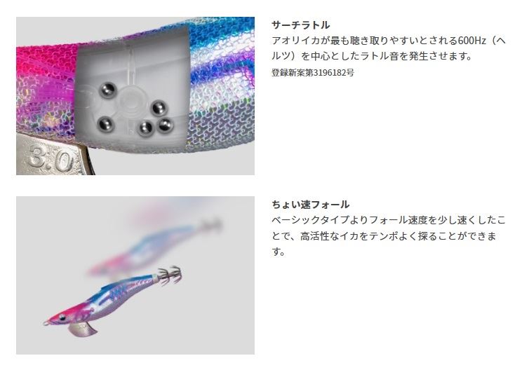 ■商品説明 ストロボフィンが生み出す平打ちアクションによる光、ラトルによる音を武器にしたハイアピールモデルです。 ボディの広い面でギラっと光を反射させてイカを誘います。 また、生態研究に基づいたイカが感知しやすいラトル音で広範囲を効率よくサーチすることが出来ます。 ■仕様 規格:2.5号 全長(針ヌキ):79mm カラー:075/ブルームピンキー 布の種類:ラメ布 ボディカラー(下地):ネオンブライトブルー/ピンク 重量:12g 沈下スピード:約3.6秒/m ■注意事項 ※画像はイメージです。サイズ、カラー違いの商品を含みます。実際の商品とは異なる場合があります。