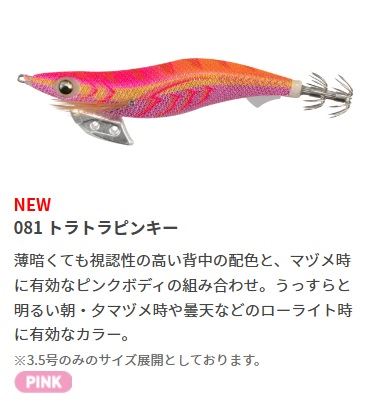 ■商品説明 変わり続けるフィールドに対応するために生まれた、低活性のイカを釣るためのエギ王Kに待望の新色がリリース! ■仕様 規格:3.5号 全長(針ヌキ):105mm カラー:081/トラトラピンキー 布の種類:ラメ布 ボディカラー(下地):ピンク 重量:22g 沈下タイプ:ベーシック 沈下スピード:約3.0秒/m ■注意事項 ※画像はイメージです。サイズ、カラー違いの商品を含みます。実際の商品とは異なる場合があります。